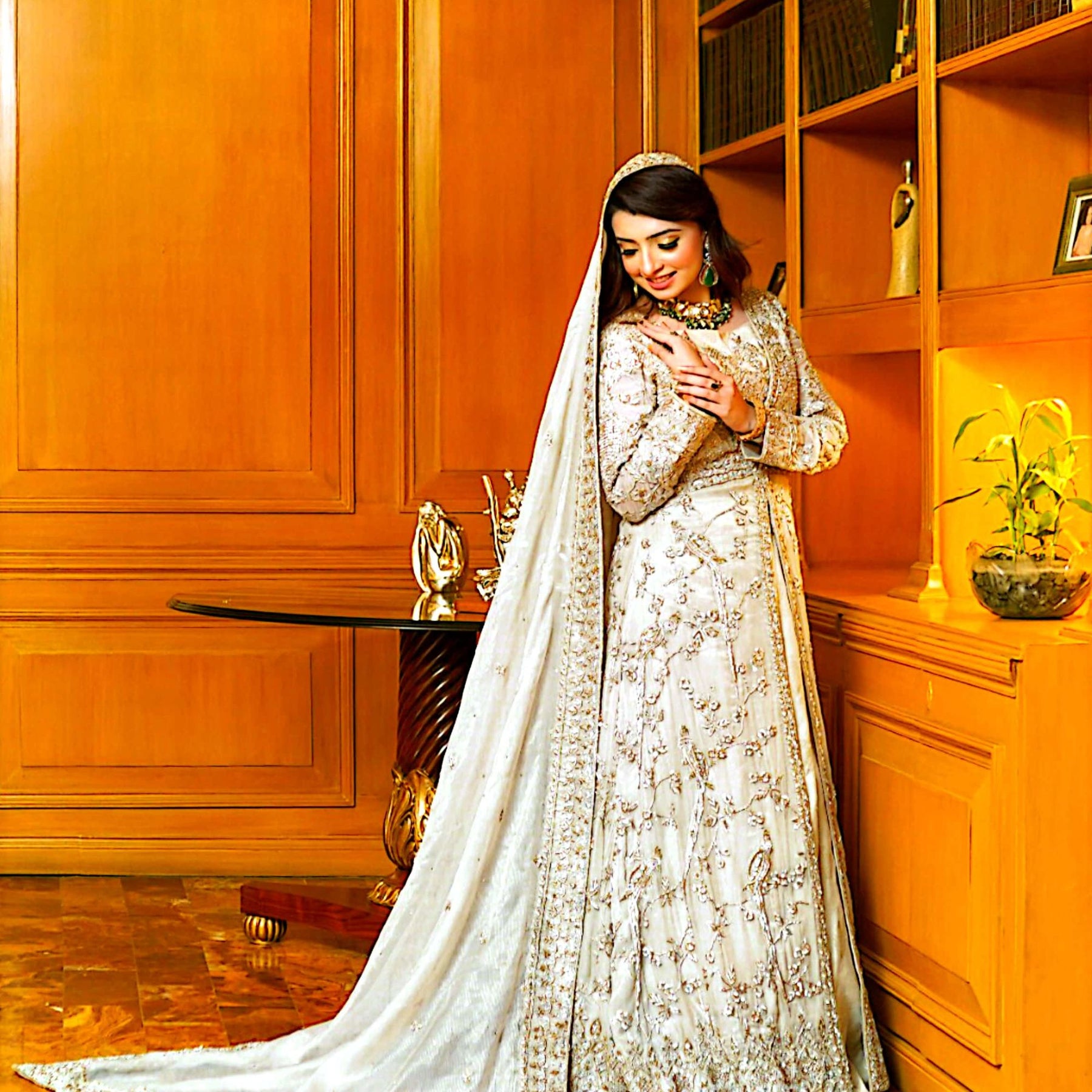 Radiate regal elegance in this handmade silver bridal maxi, a timeless piece crafted from pure raw silk and adorned with intricate hand-embellished adda work on both the front and back. Paired with a matching net dupatta and veil, this ensemble is designed for brides who desire refined grace with a touch of grandeur.